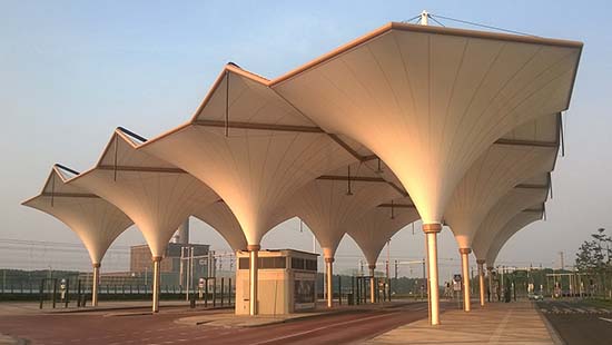 固定與張拉:膜材通過夾具或?qū)S霉潭ㄏ到y(tǒng)與支撐結(jié)構(gòu)相連,同時利用液壓設(shè)備對膜材進(jìn)行張拉,以確保其表面光滑且具有一定的張力。這一步尤為關(guān)鍵,因為張拉不當(dāng)可能會導(dǎo)致膜材在風(fēng)雨中產(chǎn)生波動或撕裂。