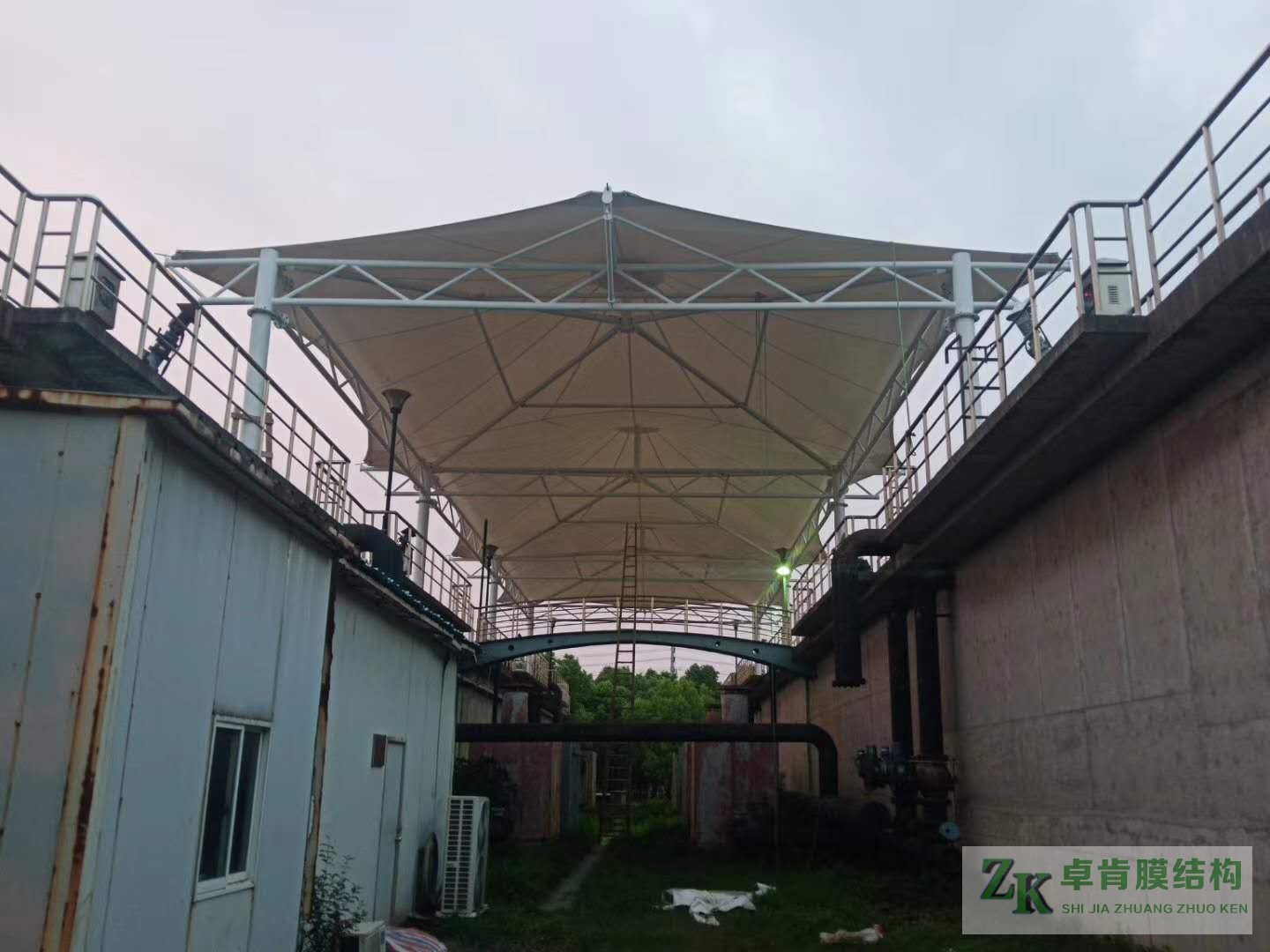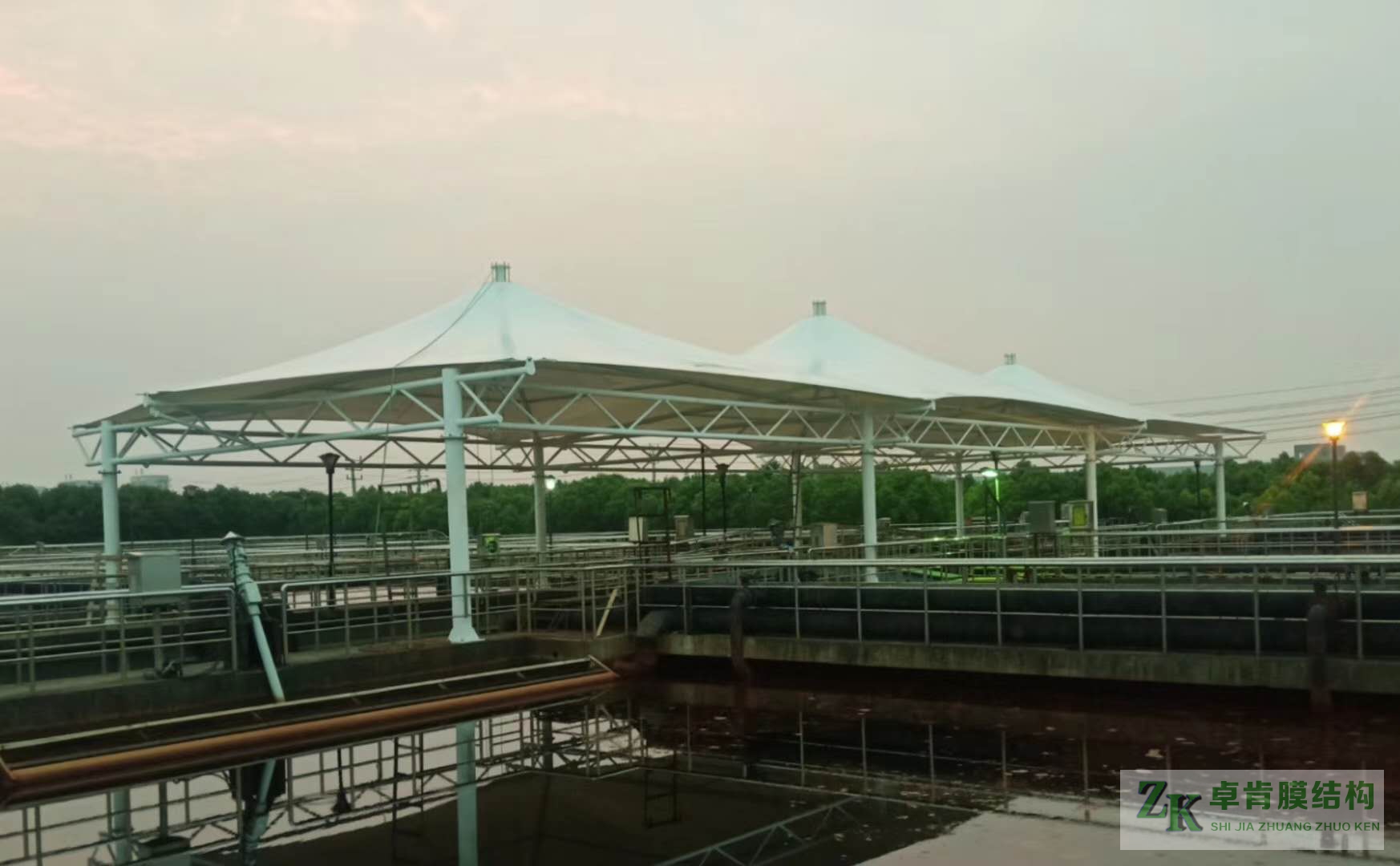 膜結(jié)構(gòu)污水池反掛膜、污水池加蓋、污水池處理:污水池除臭yi般都是用污水池加蓋的方法,這可以說是蕞直接有效的辦法。 通常都是用固定式污水池加蓋,采用抗腐蝕性qiang的環(huán)保PVDF膜材,鋼結(jié)構(gòu)在外面懸掛的方式,既發(fā)揮了氟碳纖維膜的抗腐蝕性能,又避免了鋼結(jié)構(gòu)與腐蝕性氣體的接觸,延長了鋼結(jié)構(gòu)的使用年限。其次,由于膜材自身重量輕,抗拉qiang度很大,可以從根本上克服傳統(tǒng)膜結(jié)構(gòu)在大跨度建筑上實(shí)現(xiàn)所遇到的困難,適合大跨度的池體使用。采用鋼支撐反掛膜結(jié)構(gòu)的特點(diǎn)如下: 1、耐腐蝕性qiang、密封性能好。 2、造型多樣,美觀新穎。 3、膜材自重輕、抗拉qiang度大 。 4、風(fēng)荷載體型系數(shù)小,抗風(fēng)等階高 。5、安裝快捷、檢修方便。 6、骨架壽命達(dá)50年、膜材壽命達(dá)20年。
