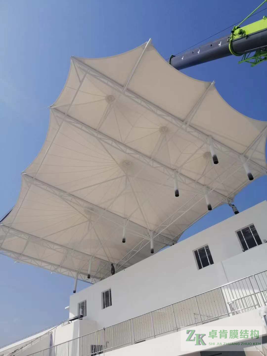 所采用的膜材具有很好的阻燃性和耐高溫性,又由于其結(jié)構(gòu)自重輕,柔性結(jié)構(gòu)且有較大變形能力,故抗震性能良好。膜結(jié)構(gòu)主席臺(tái)膜材剪切、拼合成型及骨架的鋼結(jié)均在去我們工廠內(nèi)加工制作(te shu原因除外),現(xiàn)場(chǎng)只需組裝、油漆,施工簡(jiǎn)便,施工周期較短。