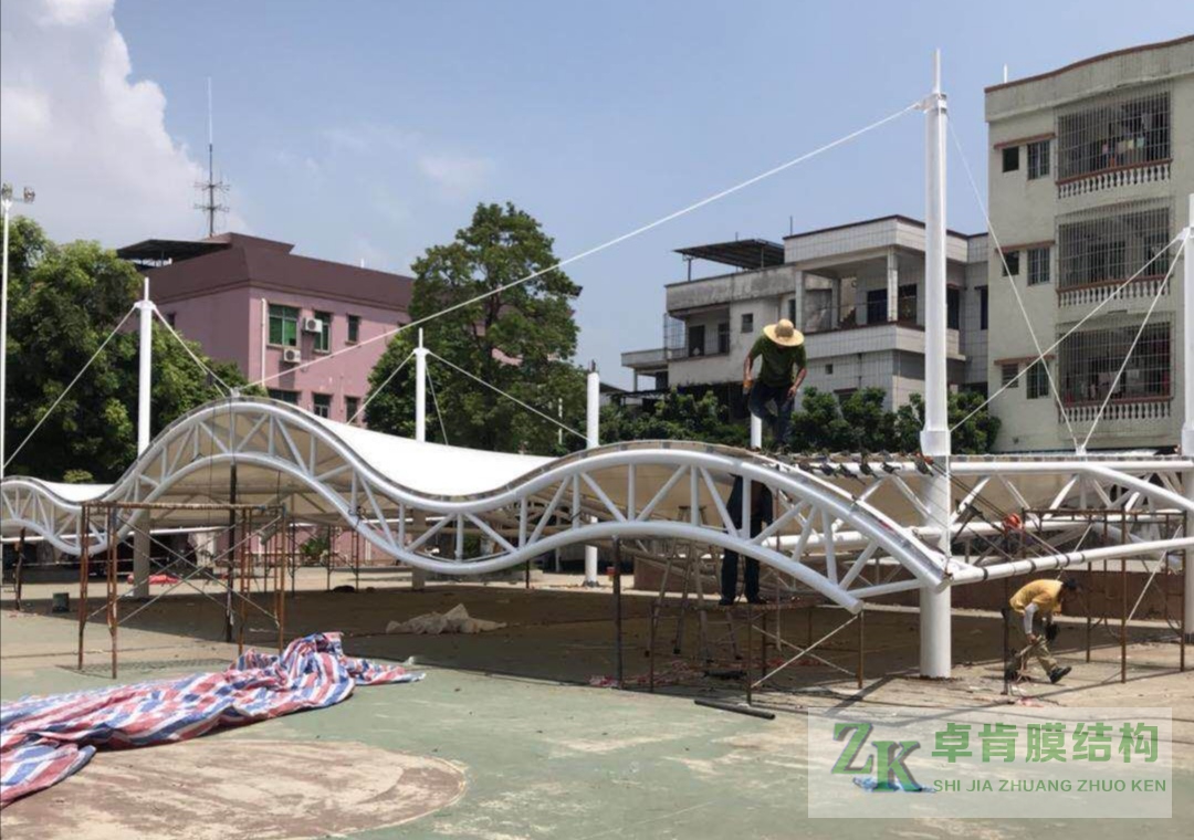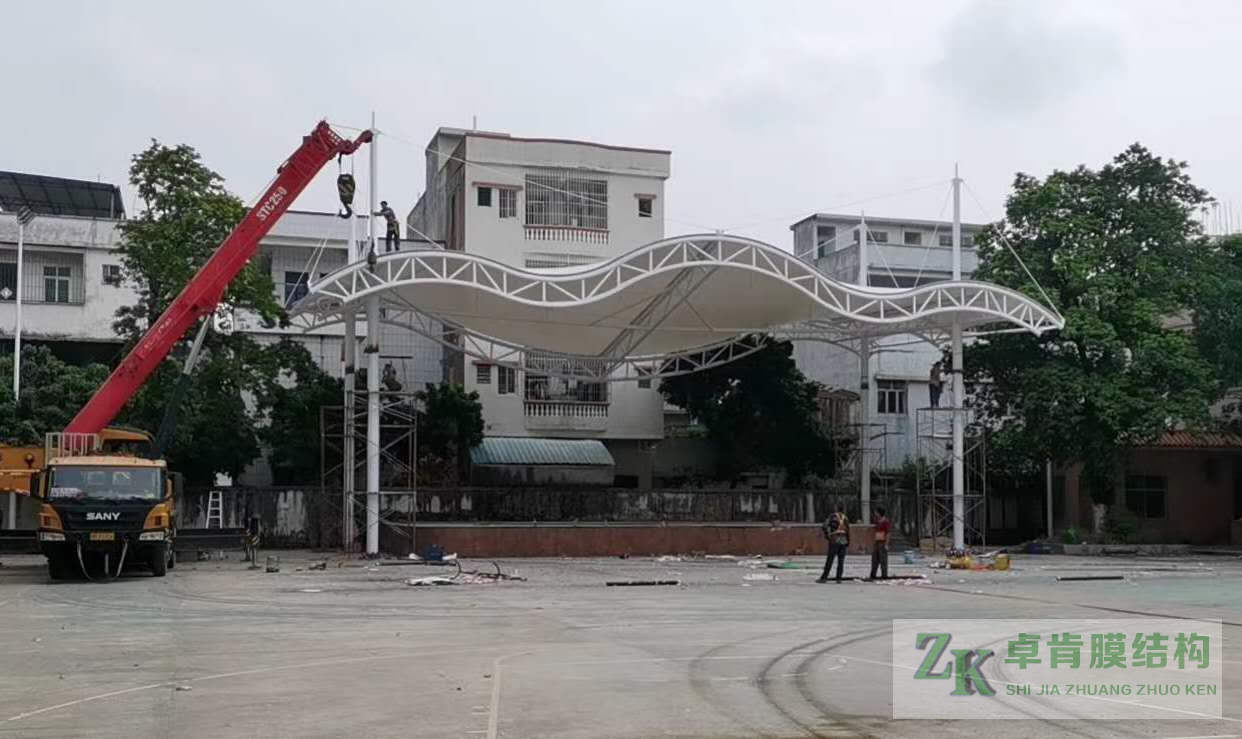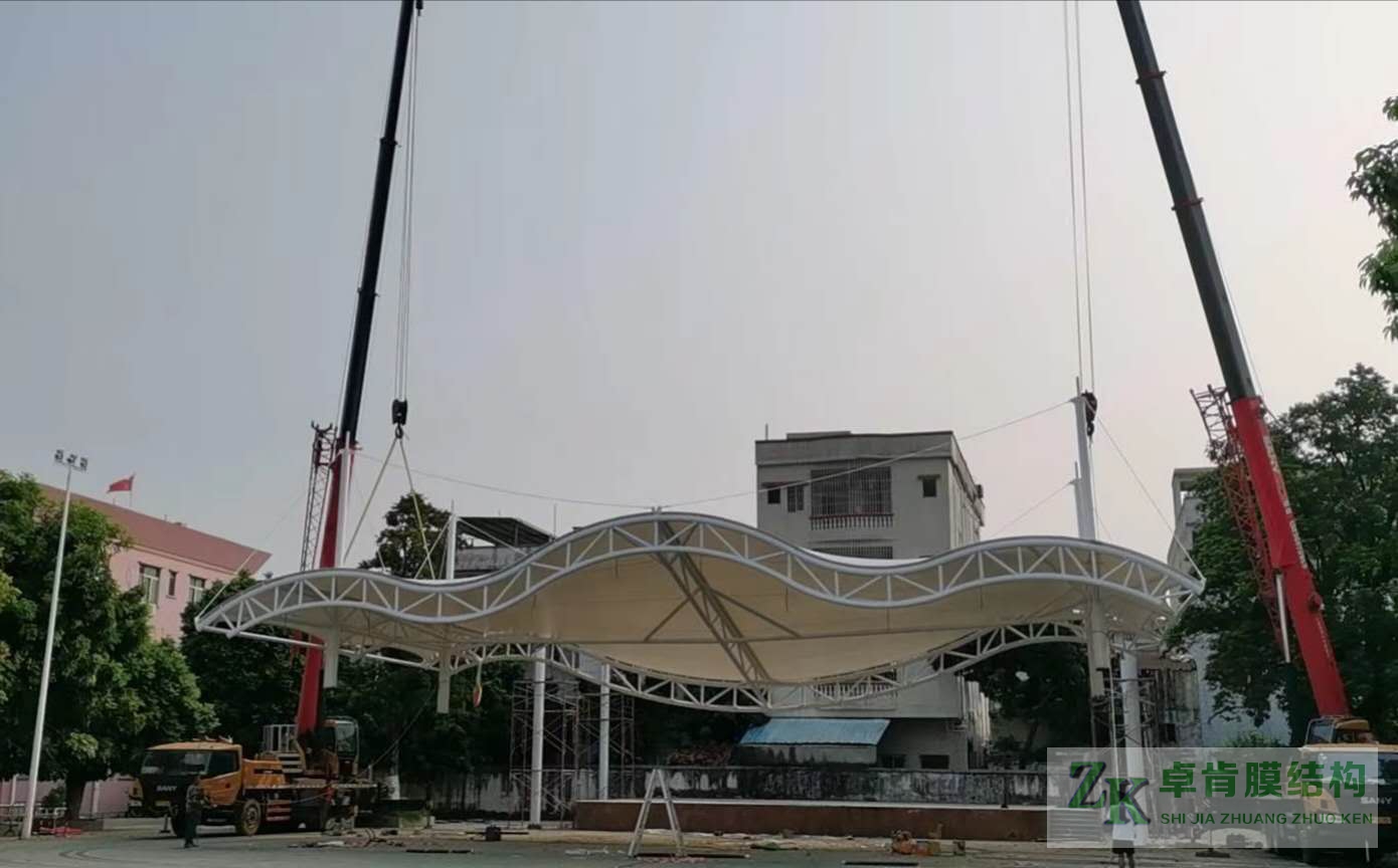 廣東東莞橫瀝鎮(zhèn) 膜結(jié)構(gòu)廣場(chǎng)舞臺(tái)遮陽雨棚掛裝完工