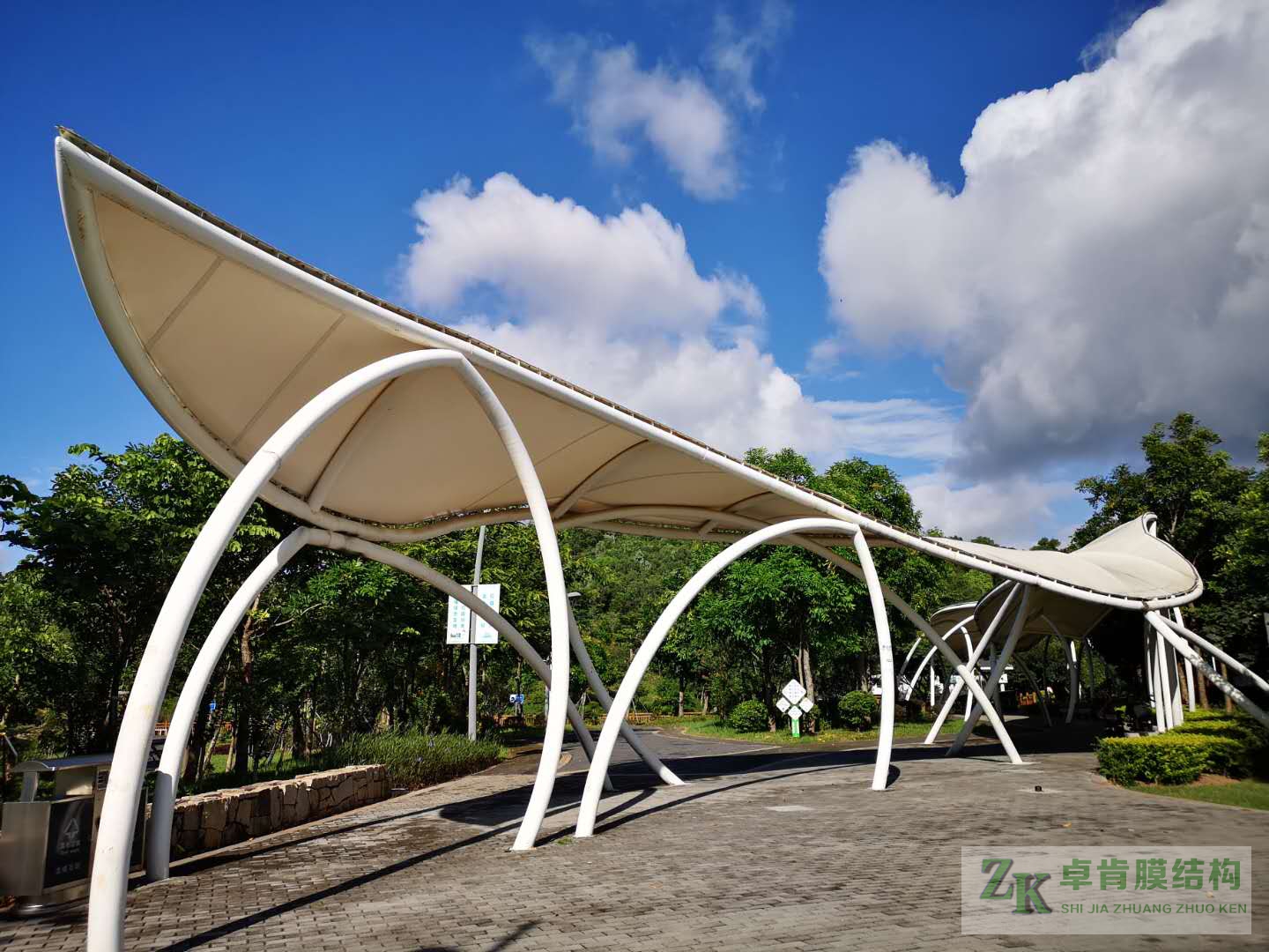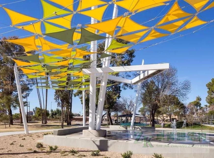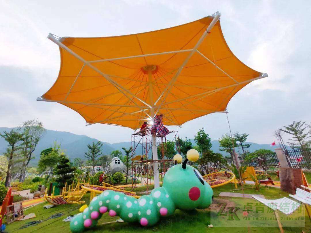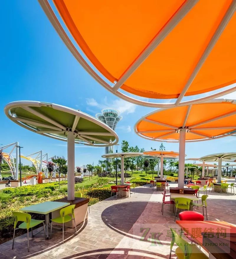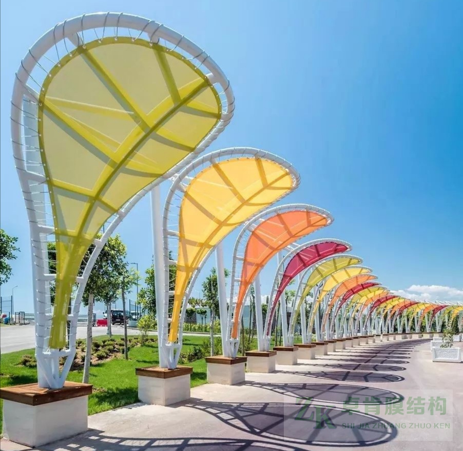 膜結(jié)構(gòu)建筑工程不止于膜結(jié)構(gòu)停車棚、膜結(jié)構(gòu)看臺(tái)體育場(chǎng)館、污水池反掛膜結(jié)構(gòu)等,色彩斑斕、靈動(dòng)的景觀膜結(jié)構(gòu)在公園里隨處可見?,F(xiàn)有yi些此類張拉膜結(jié)構(gòu)美圖,供大家欣賞,我公司可承接此類型各種景觀膜結(jié)構(gòu)工程--石家莊卓肯膜結(jié)構(gòu)公司廠家歡迎您的垂詢問價(jià)。