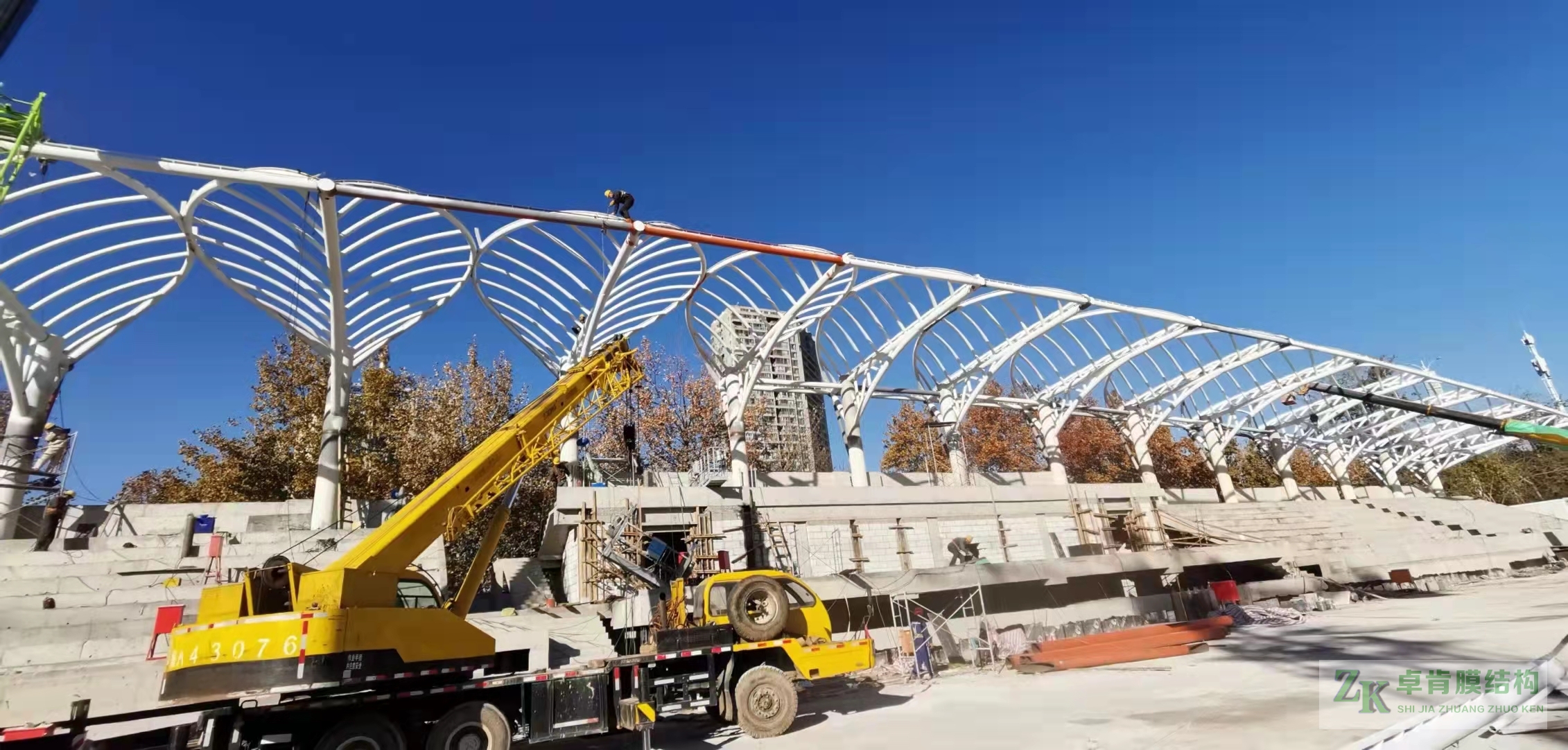 在膜結構體育看臺遮陽棚的設計中,單個”葉子”是承擔著主要功能的重要部分,它們被安裝在鋼構架上,覆蓋了整個看臺的頂部。這些單個”葉子”采用量輕、高強度、易于加工和壽命長等特點的PVDF膜材料制成。