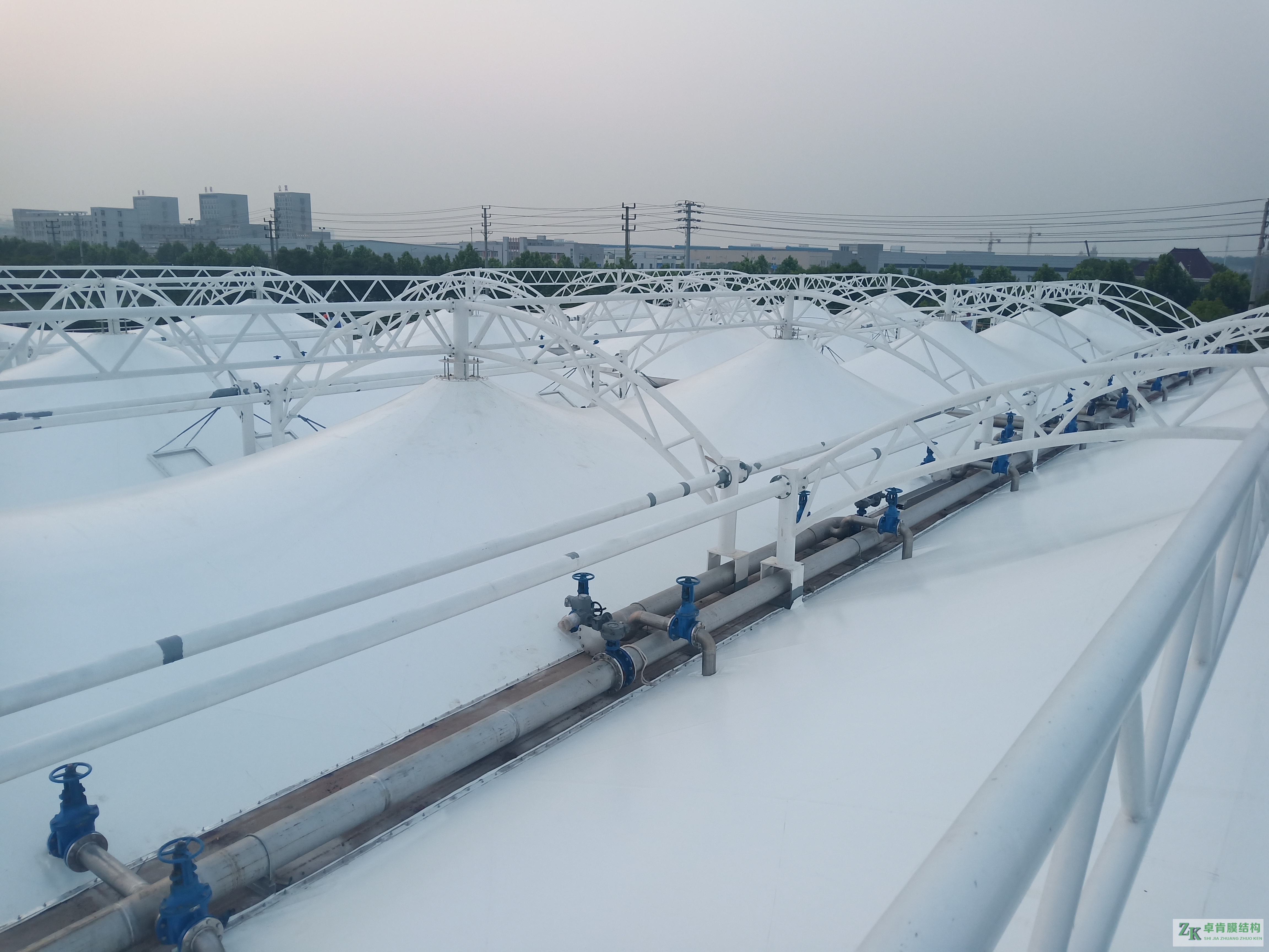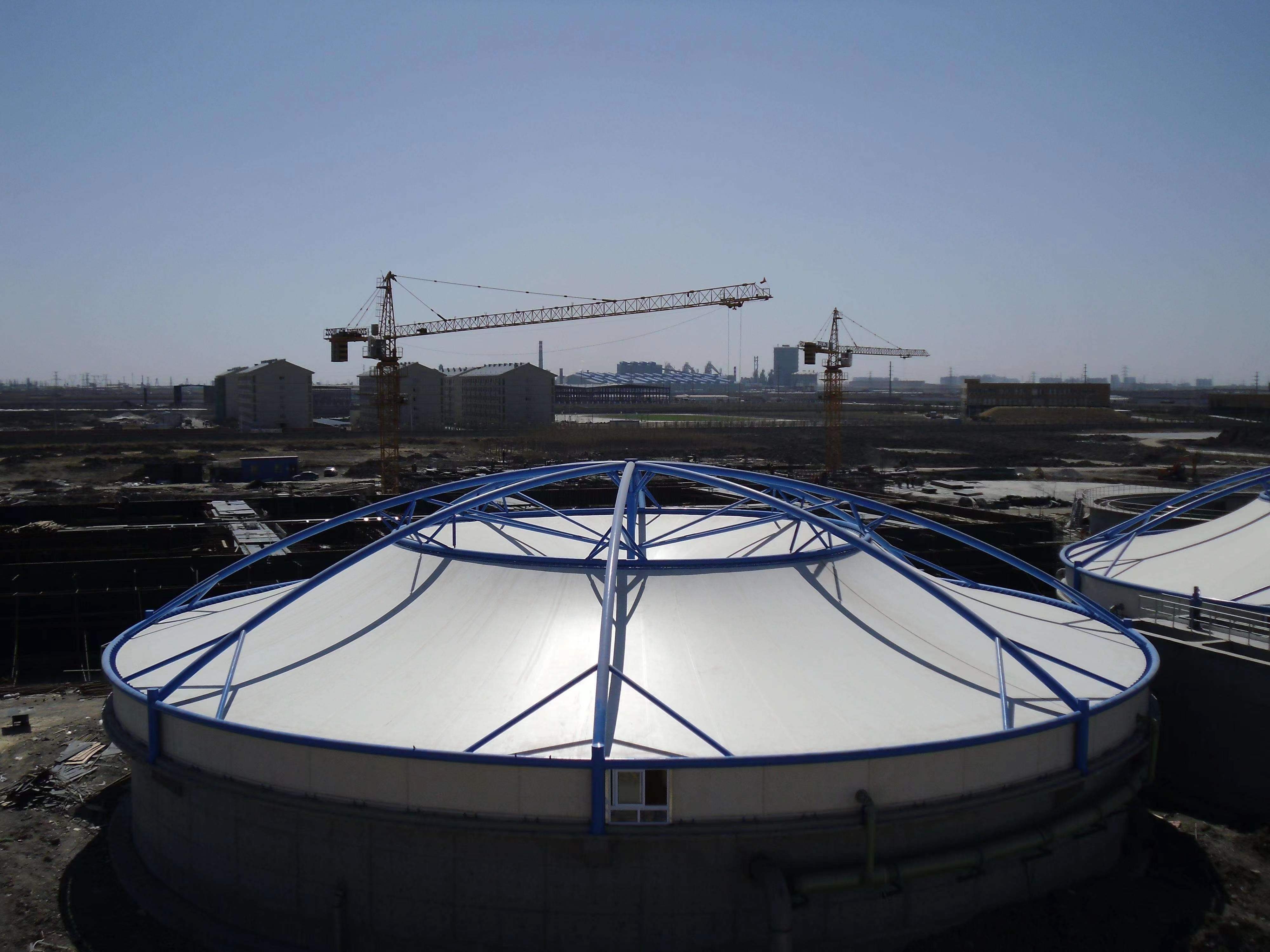 3.反掛膜結(jié)構(gòu)。反掛膜結(jié)構(gòu)優(yōu)勢就在于反掛,以膜面接觸腐蝕氣體。膜材化學(xué)性能穩(wěn)定,故而不會被腐蝕。并且膜材本身密封性能好,可以實現(xiàn)大跨度,使用壽命長達15-25年,是污水池加蓋比較適合的方案。