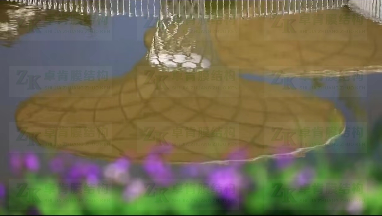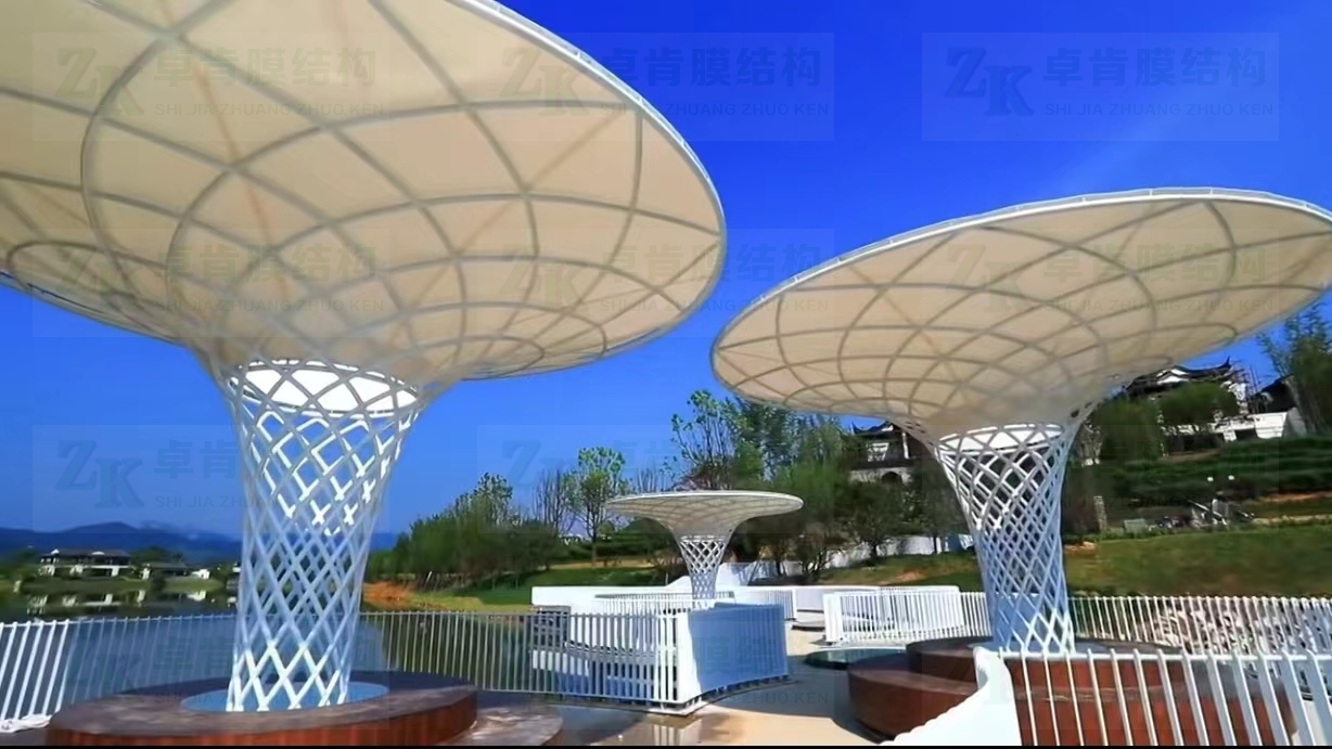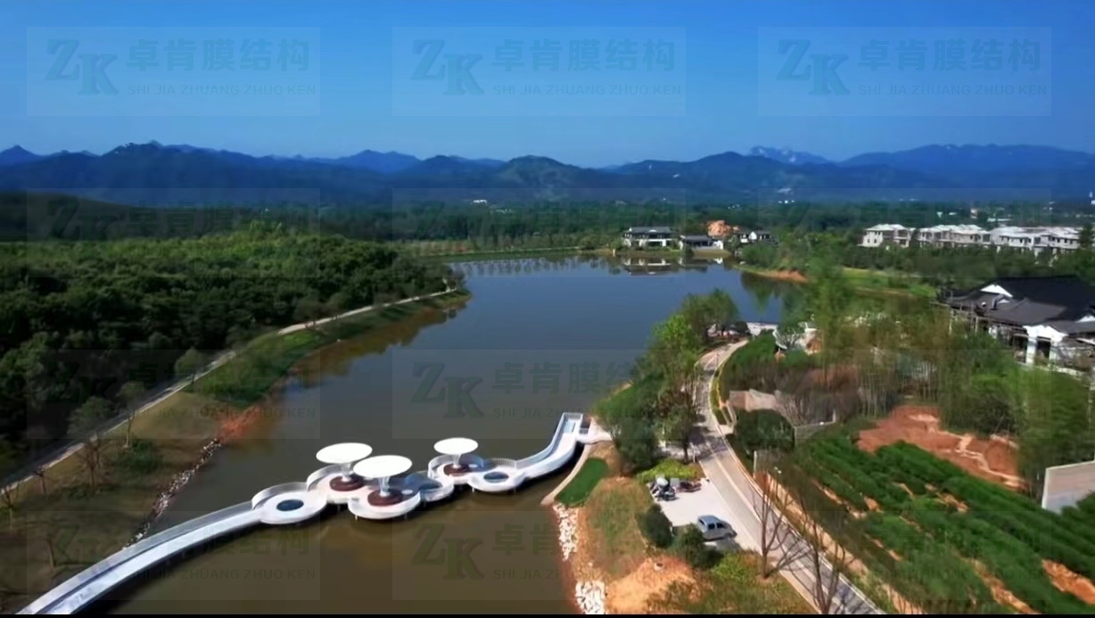 表面帶有自潔涂層,長(zhǎng)久使用也能潔白如新。結(jié)構(gòu)整體是由鋼管“編織”成的一個(gè)個(gè)花籃;膜結(jié)構(gòu)造型似一朵朵牽牛花盛開在岸邊,為整體環(huán)境營(yíng)造了輕松愜意的氛圍。白色的膜結(jié)構(gòu)和周圍的綠化、水文也是相得益彰。