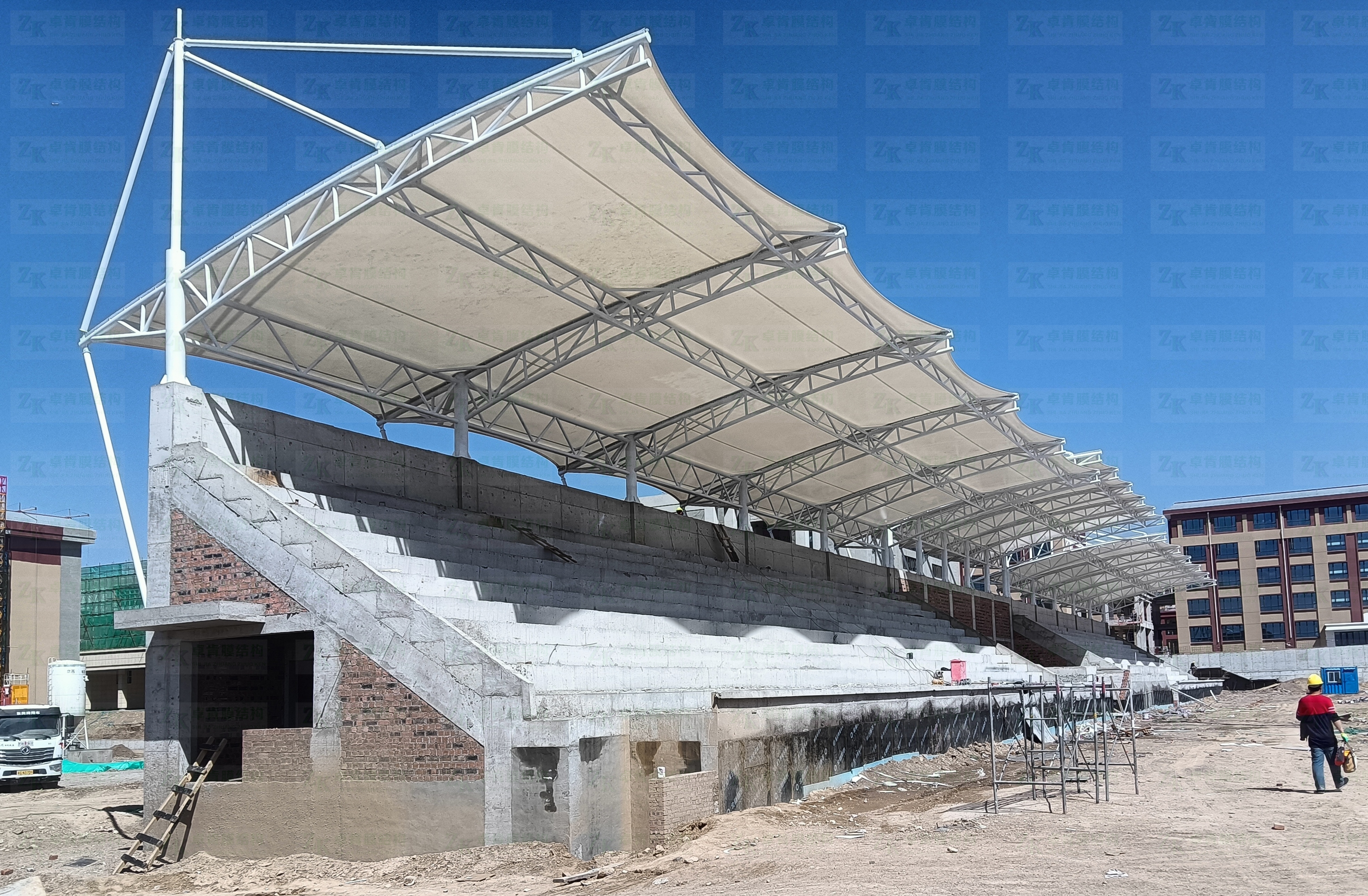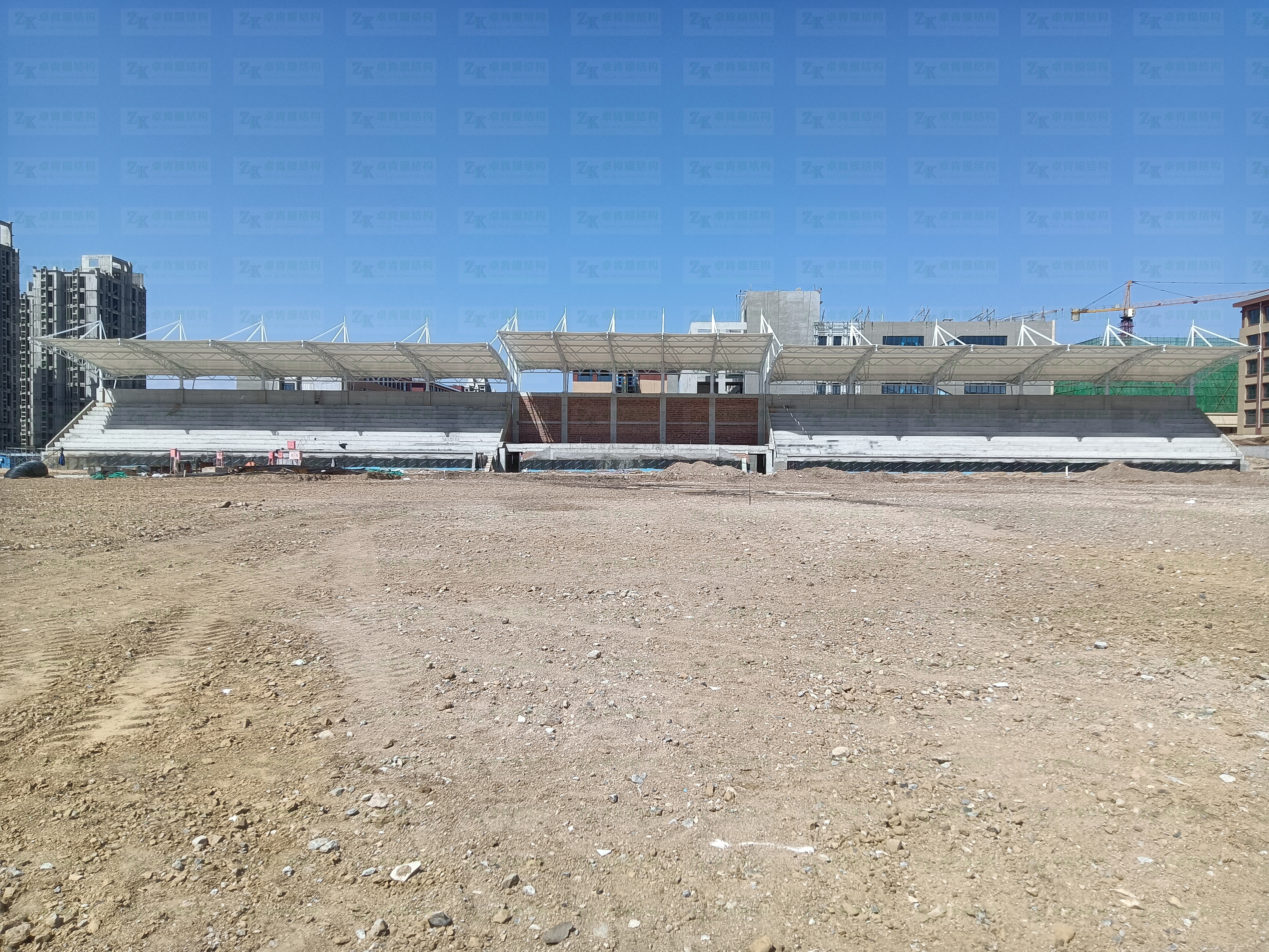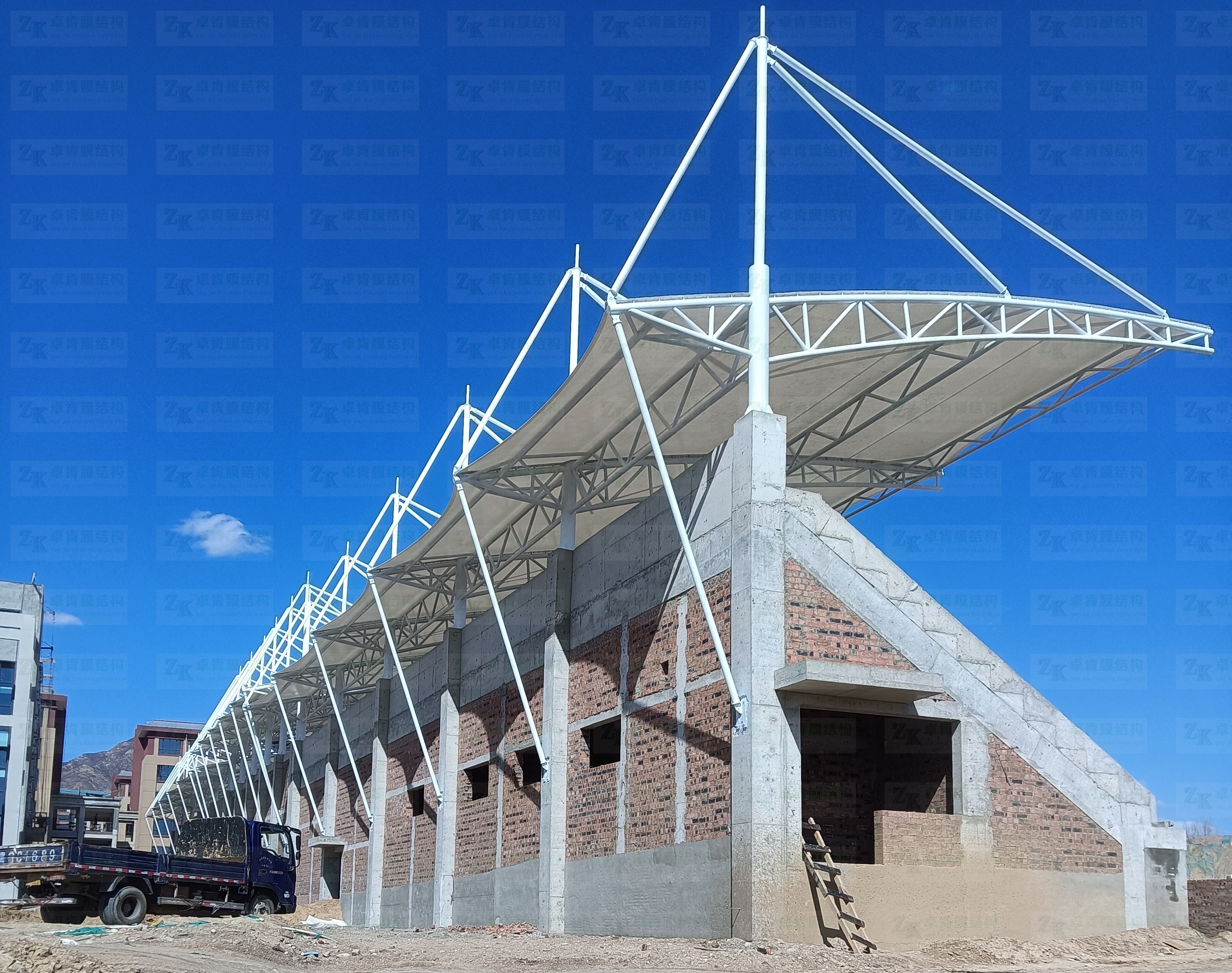 沙城學(xué)??磁_(tái)膜結(jié)構(gòu)工程,項(xiàng)目位于河北張家口市懷來(lái)縣,采用鋼桁架懸挑結(jié)構(gòu),前懸挑尺寸達(dá)11米,配合雙拉桿的使用,以增強(qiáng)結(jié)構(gòu)的抗風(fēng)壓能力,后挑結(jié)構(gòu)3米,膜結(jié)構(gòu)看臺(tái)總長(zhǎng)度110多米,膜材面積1500平。