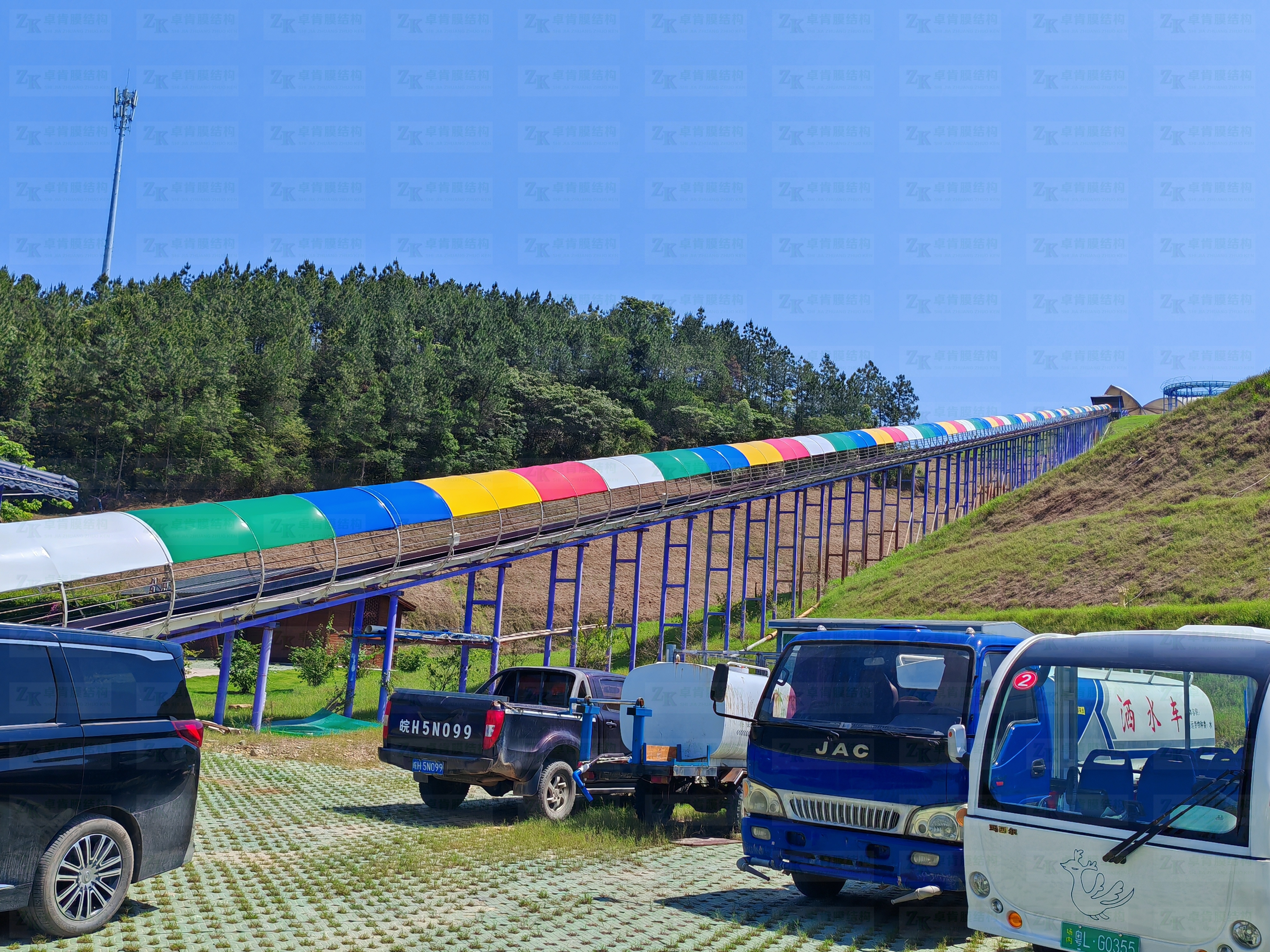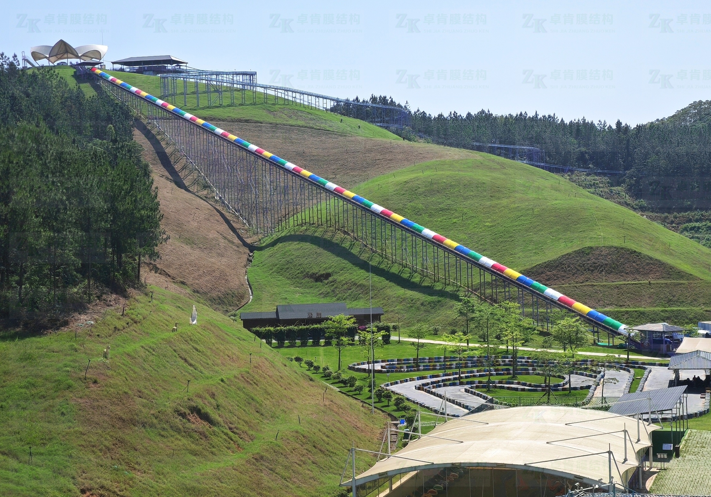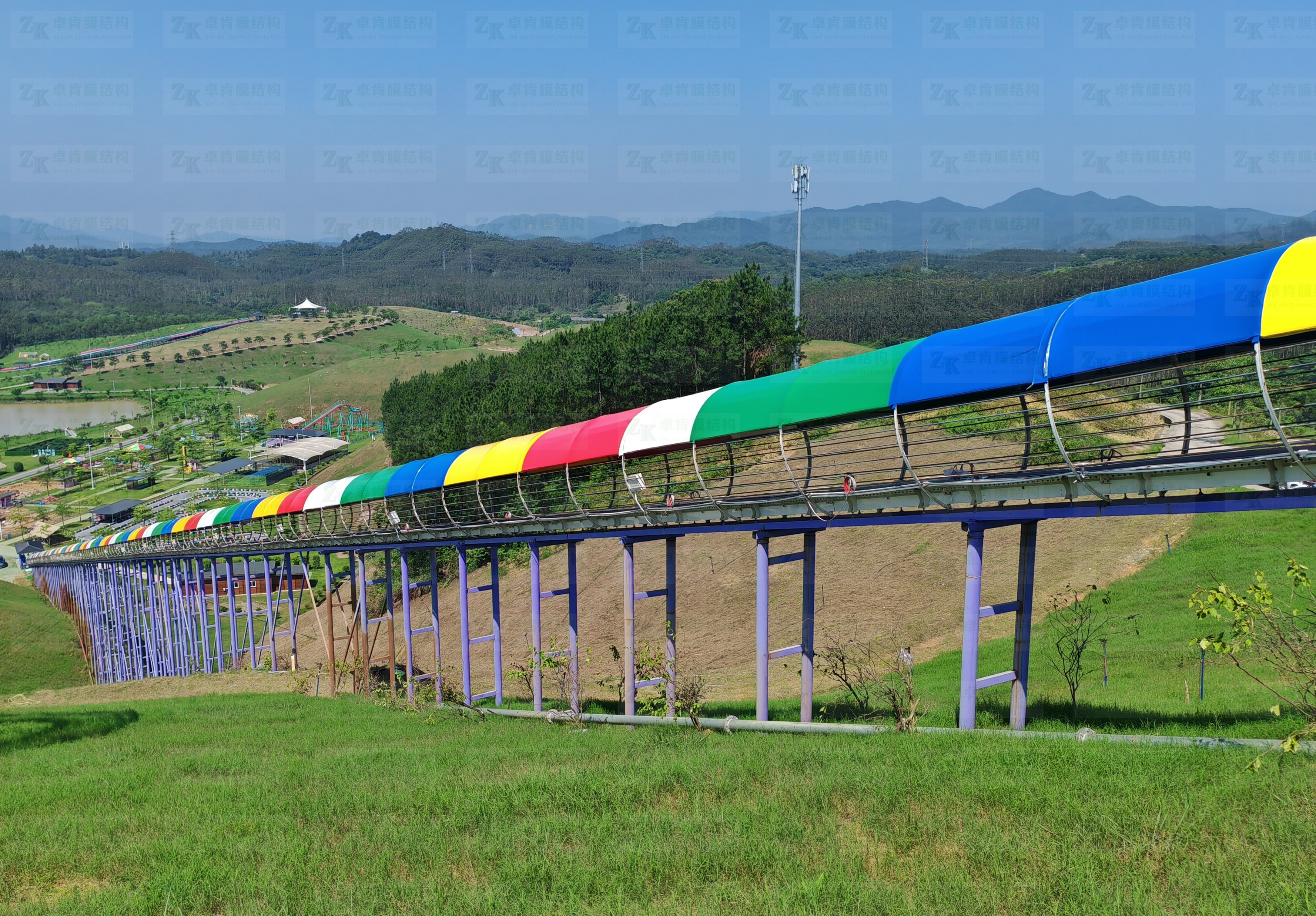 300米長的彩色膜結構遮陽長廊穿行于山間,遮擋了日光強烈,讓你漫步其中時感受到清涼也夢幻。本工程色彩繽紛,真正成為了景區(qū)的一道靚麗風景線。